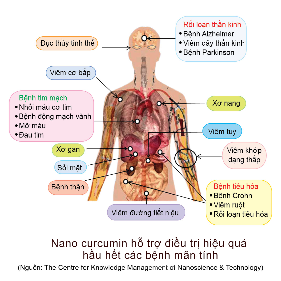Bệnh viêm khớp mạn tính: Nano Curcumin được xem như một trong những chất kháng viêm tối ưu và không phản ứng phụ khi sử dụng để hỗ trợ điều trị bệnh viêm khớp, viêm khớp dạng thấp và thoái hóa khớp. Nano Curcumin ức chế mạnh mẽ các enzyme liên quan đến sự khởi phát của quá trình gây viêm, bao gồm cả các enzim lypoxygenase và Cyclooxygenase-2 (Cox-2), ức chế sản xuất các Prostaglandin và các chất trung gian gây viêm gây ra quá trình viêm và sưng đau ở các khớp tương đương với cortisone, phenybutaron…